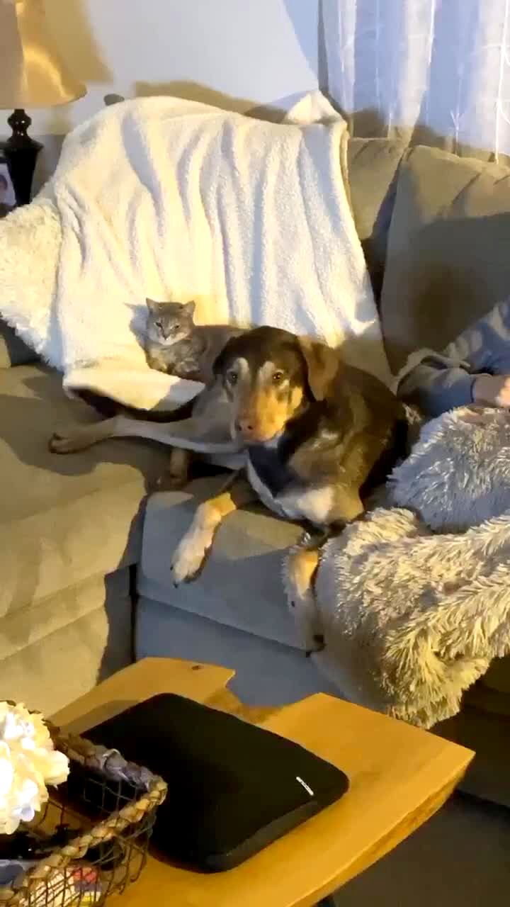A man asks a dog if it's a good boy, and it wags its tail and repeatedly hits a cat in the face on a couch in a living room.