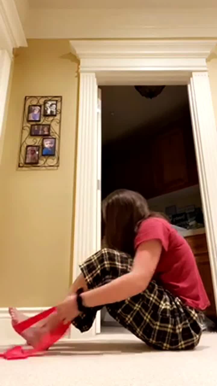 A young girl has a band around her neck and feet but it slips off of her feet and hits her face.