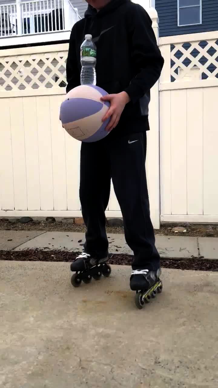A young boy in a driveway stands on roller-skates and drops a basketball with a water bottle onto the ground and the bottle bounces back up and hits him in the junk.