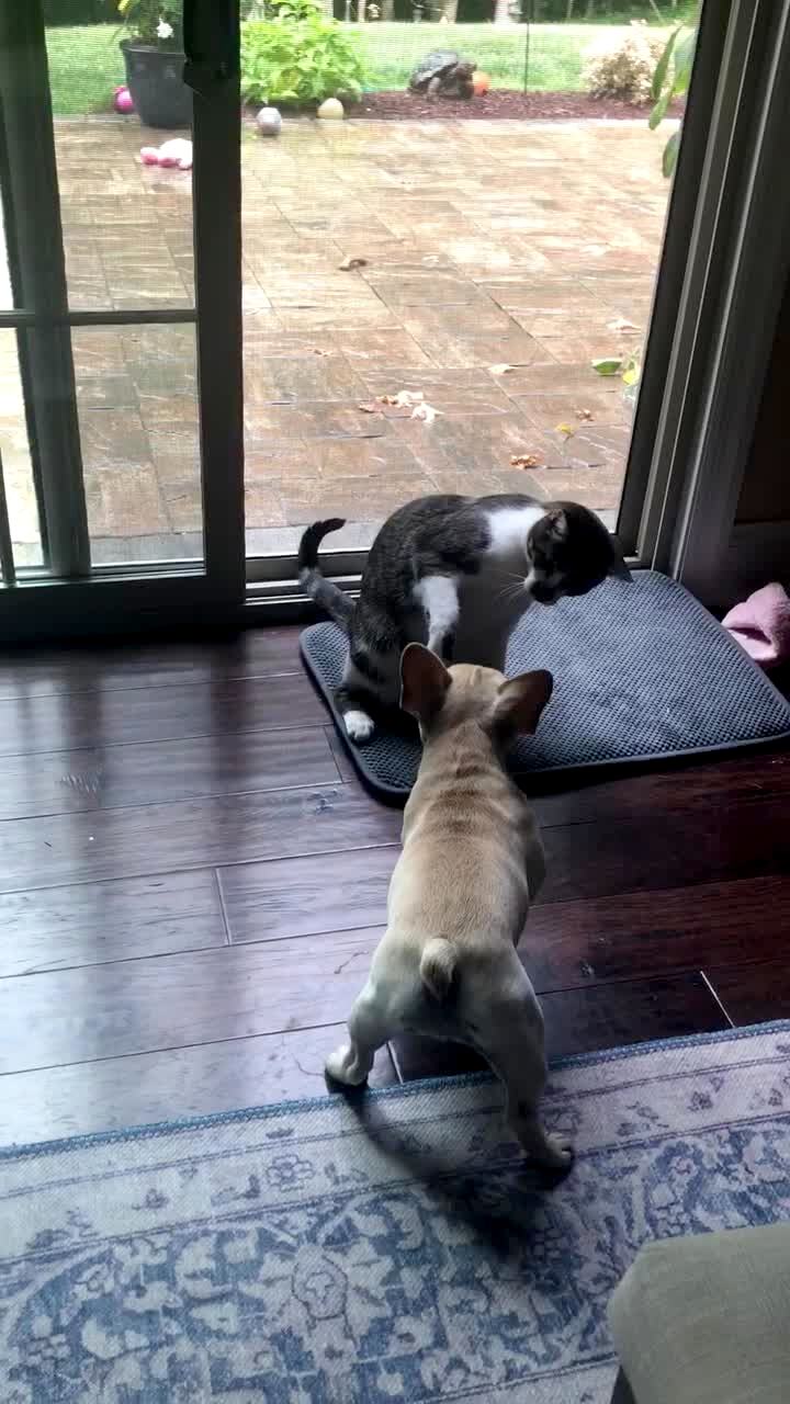 A dog tries to get outside but a cat guards the back door and hits the dog in the head repeatedly.