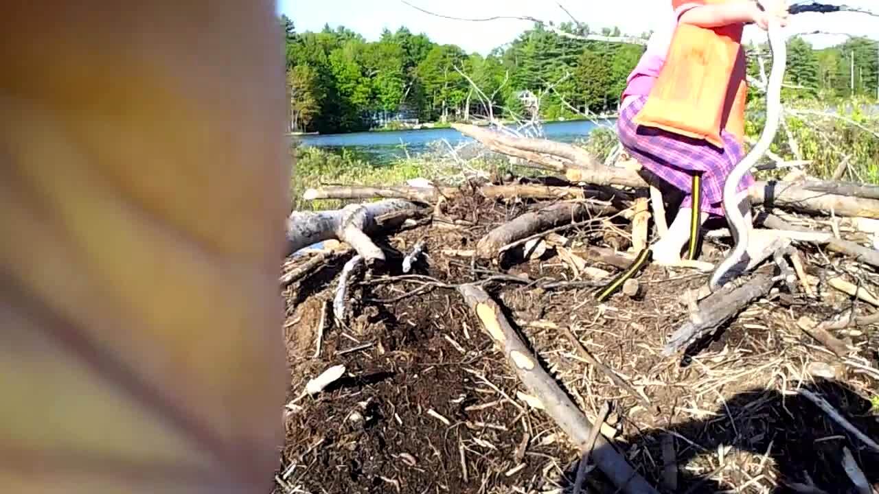 A young girl picks up a large snake while looking through wood.