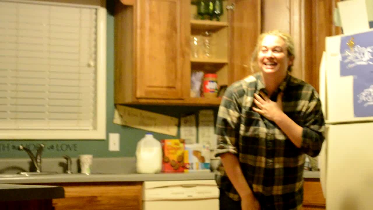A woman gets scared of an inflatable snake in her kitchen indoors.