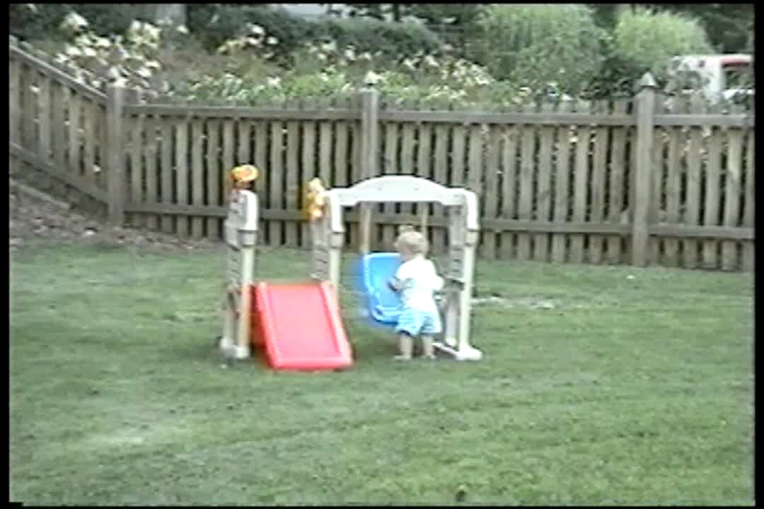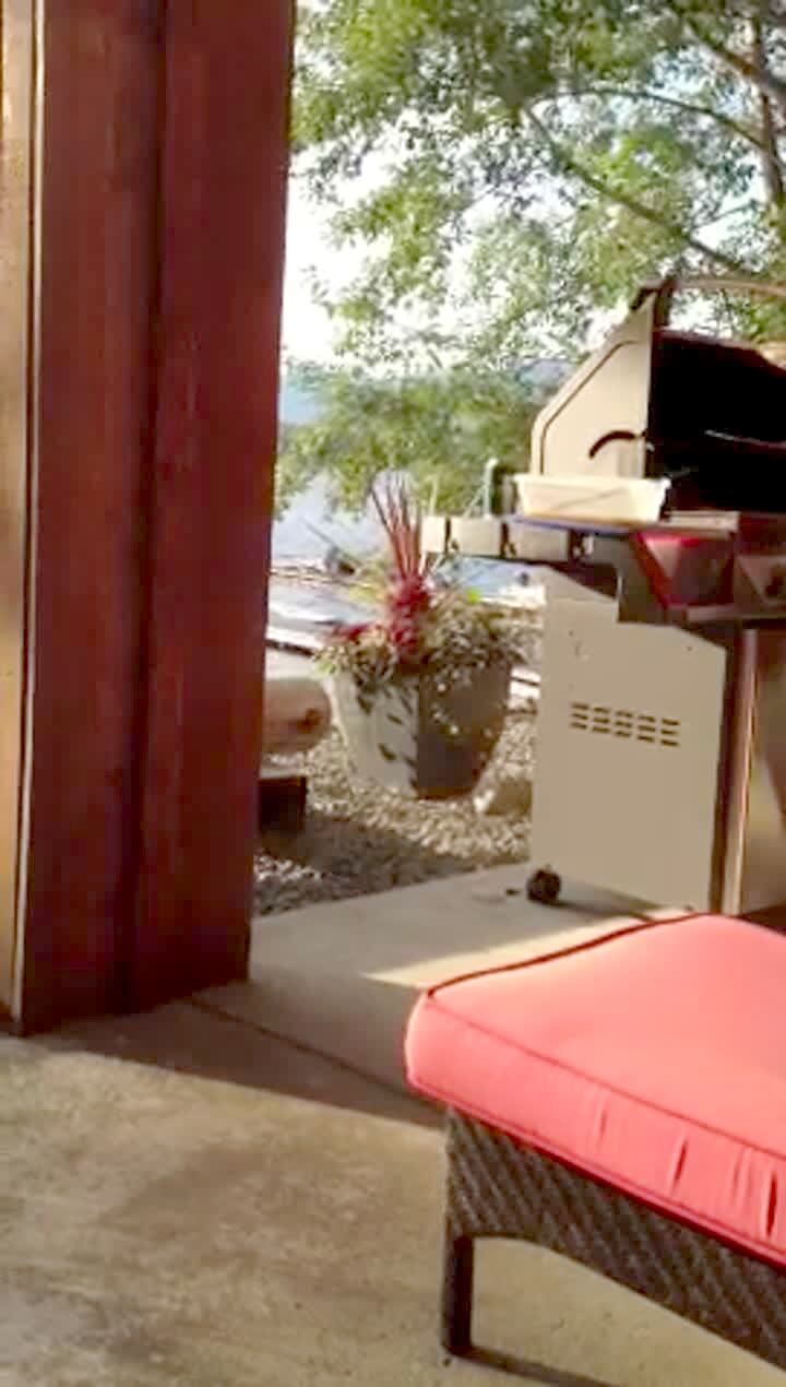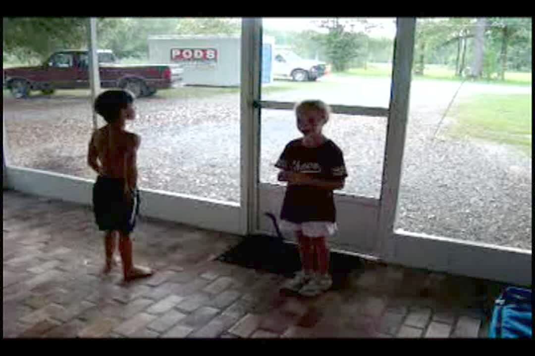 Young boy & girl show off a dead snake they've attached to the handle of the patio door. When woman comes home & sees the snake she screams & runs back to her car. Practical joke. Scare.