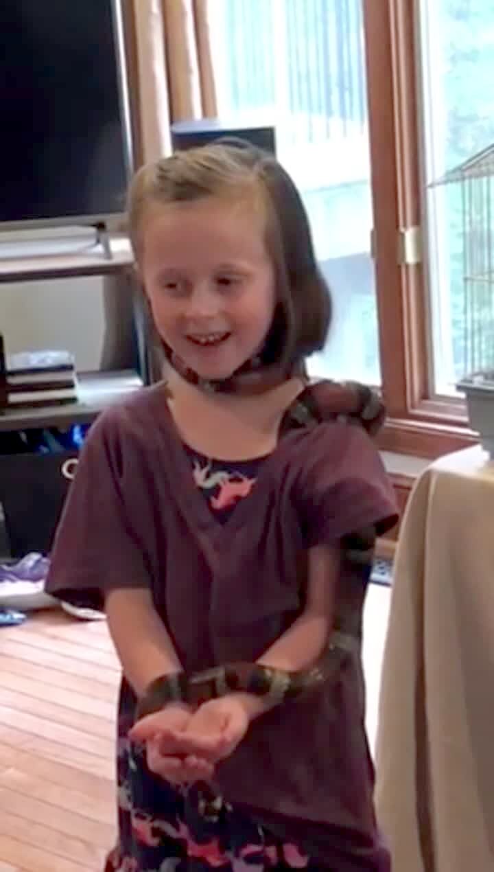 A young girl holds a snake in a house and it slithers around her neck and into her mouth and she screams and laughs.