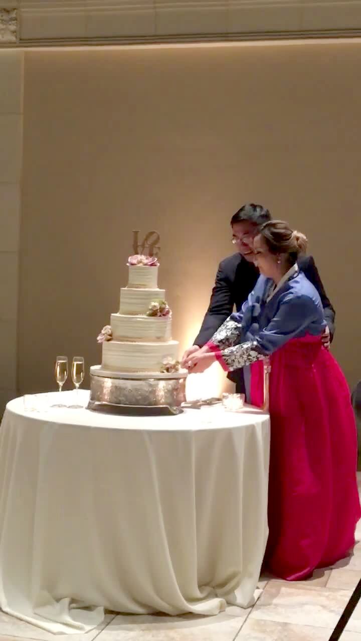 At a wedding reception, a bride smashes cake on a groom's face when he smashes some in her face and she stumbles and falls backwards. Music rights not cleared.