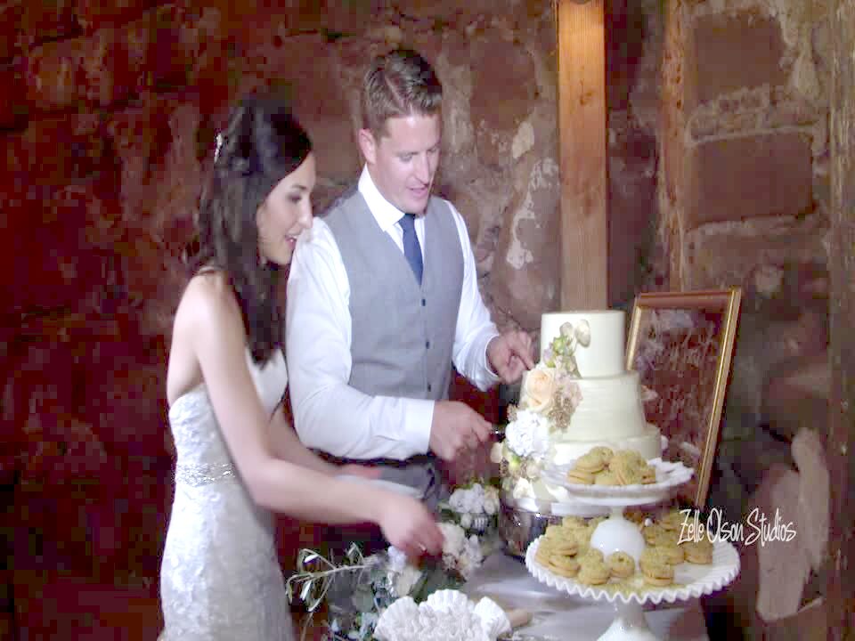 Groom smashes wedding cake in bride's face causing her to fall down. Reception.