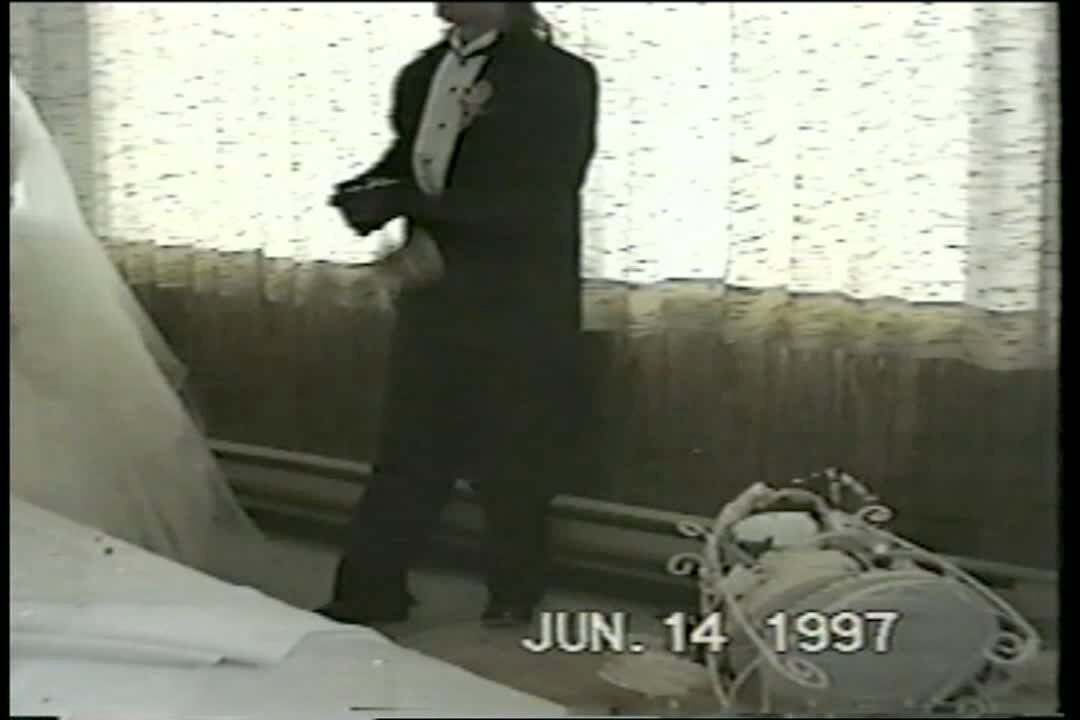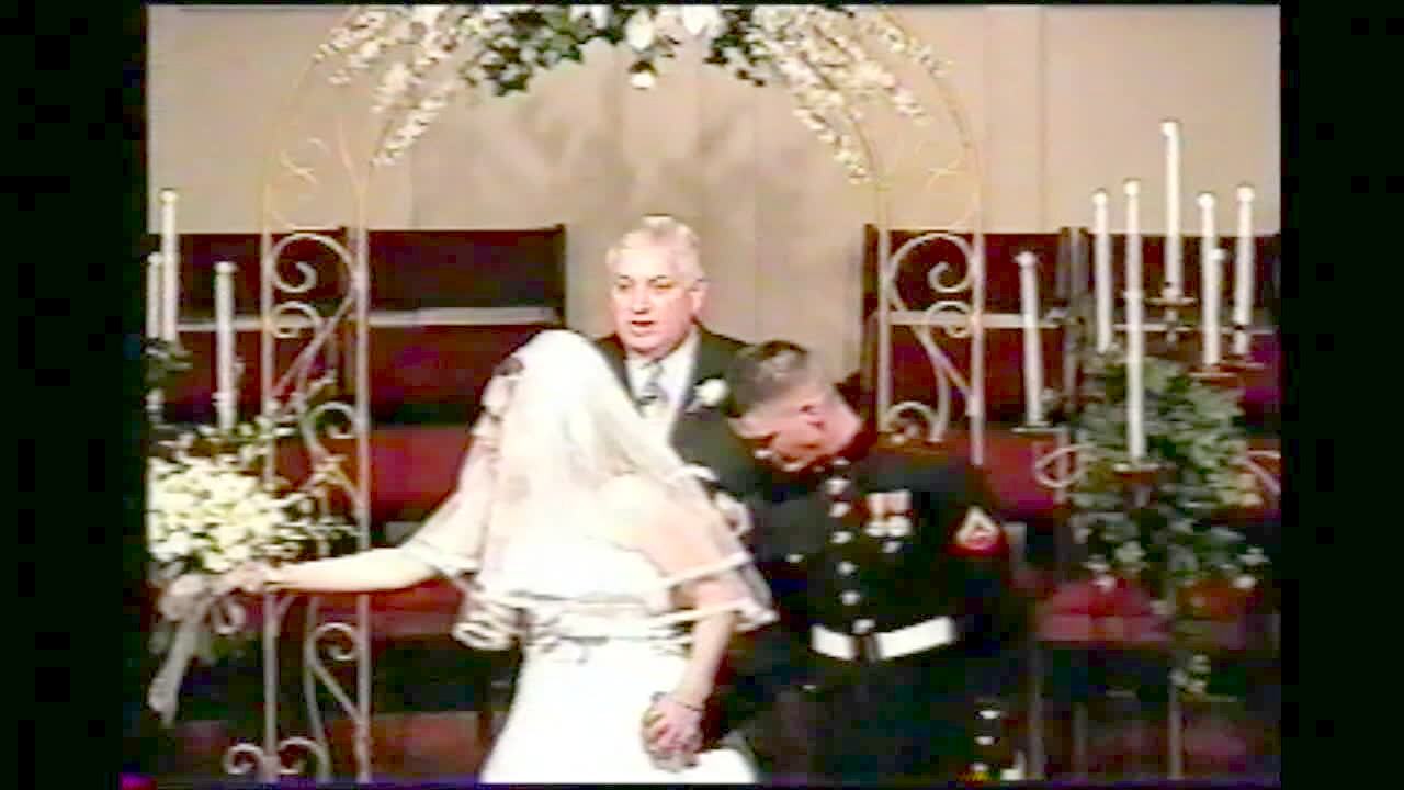 Groom tries to dip bride during kiss but they both fall off stage & down the stairs. Wedding ceremony.