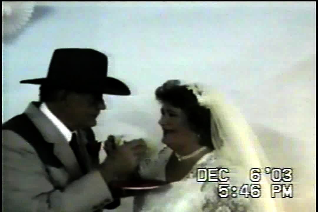 A bride at a wedding reception falls on her butt when she backs away from her husband as he tries to smash a piece of wedding cake in to her face.