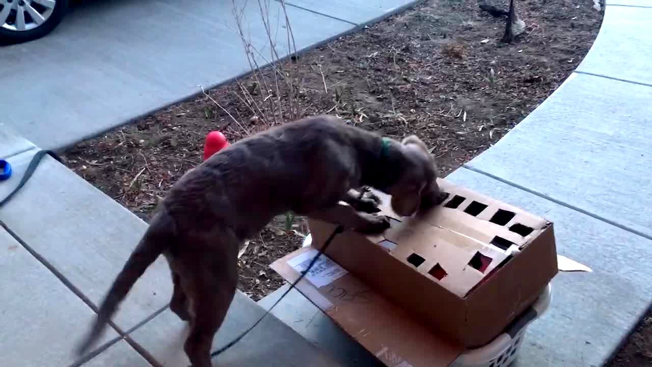 A young boy hides in a laundry basket with a box with holes on top and sticks a treat through the holes and a puppy dog tries to get it. The dog then climbs on top of the box and rips at it to get the snack.