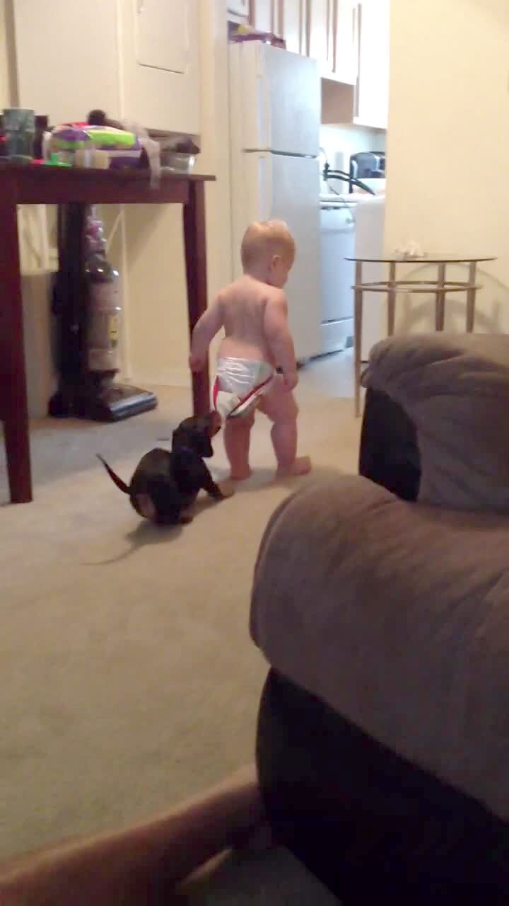 Tot boy has both legs in 1 pant leg and gets pulled around the house by a dog.