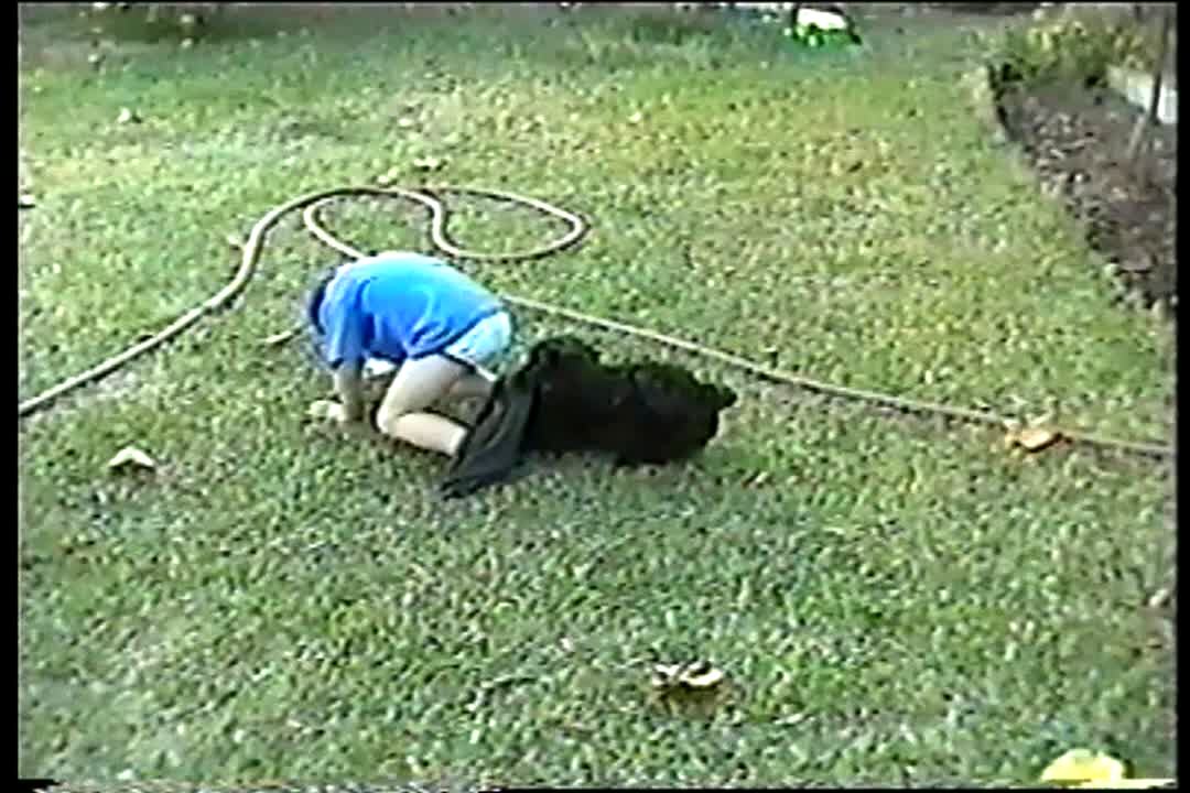 Puppy dog pulls off little boy's shorts and runs away with them. Cute.