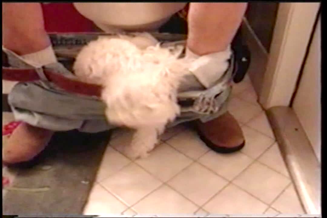 Man is going to the bathroom on toilet. Small dog lays down in man's pants around his ankles. Odd. Funny visual. Silly pet tricks.