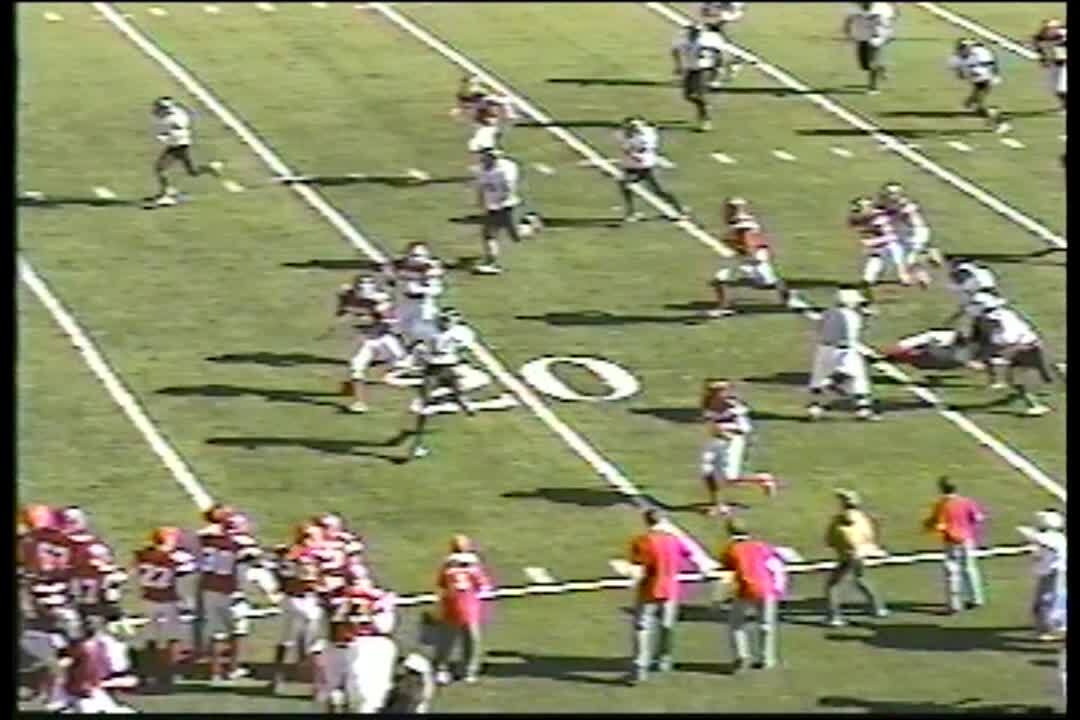 High school football running back breaks through pileup, runs for touchdown, gets pants grabbed/pulled down by other player.