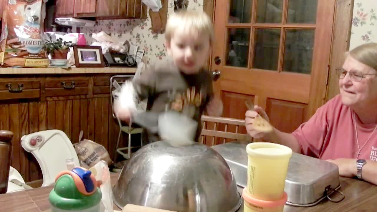 A boy tot sits next to a woman at a kitchen table while the boy bangs on pots and pans with a spatula. It's a loud noise, but the camera pans to the left revealing a man in a deep sleep in a chair, snoring away.