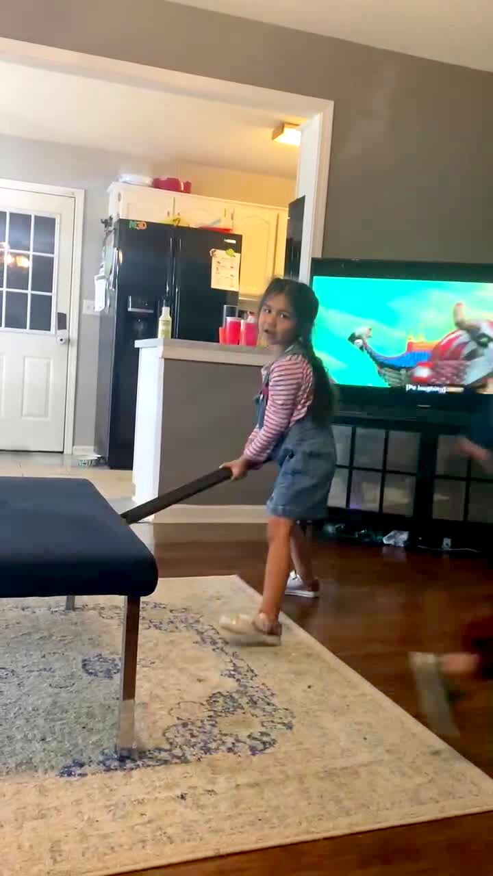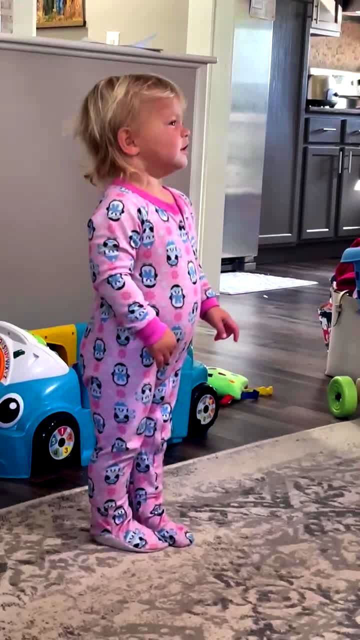 A young girl on a living room yells at Alexa to play Baby Shark. Her mother holding the camera tells her they don't have Alexa and the girl looks confused.