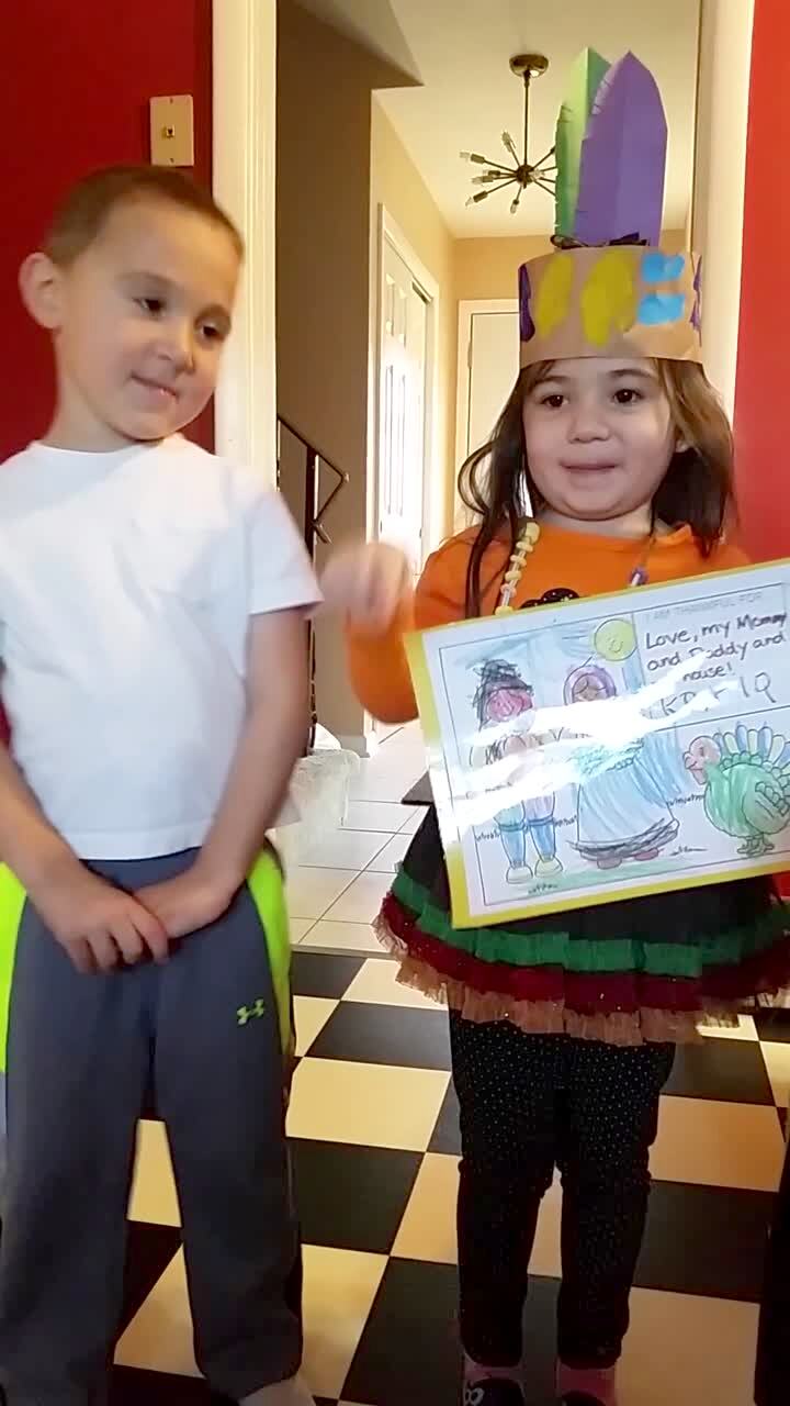 A young girl says she is thankful for "love, my mommy and daddy and my house" and a boy asks, "What about me?" and she says, "Um, I don't wanna be thankful for you" in the living room.