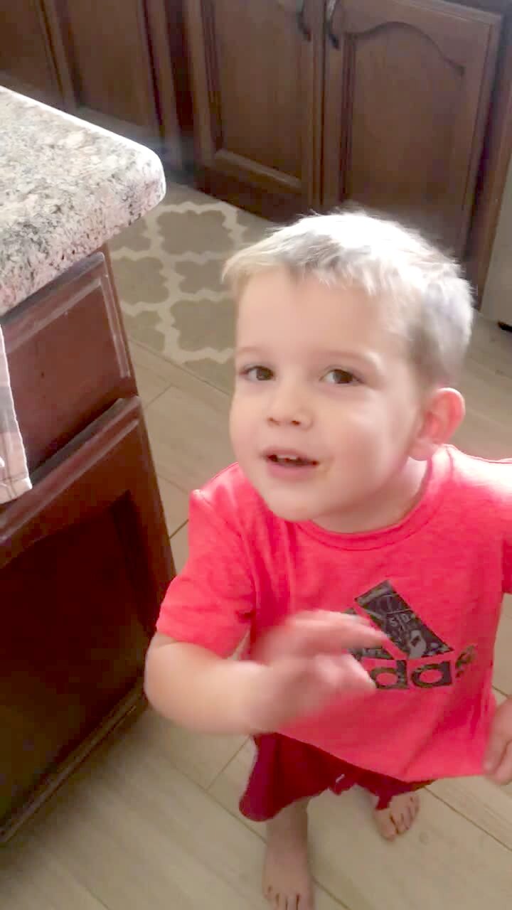 A tot boy talks to mom as he struggles to take out the recycling and garbage then all of the bottles in the bag fall out and mom laughs in the backyard.