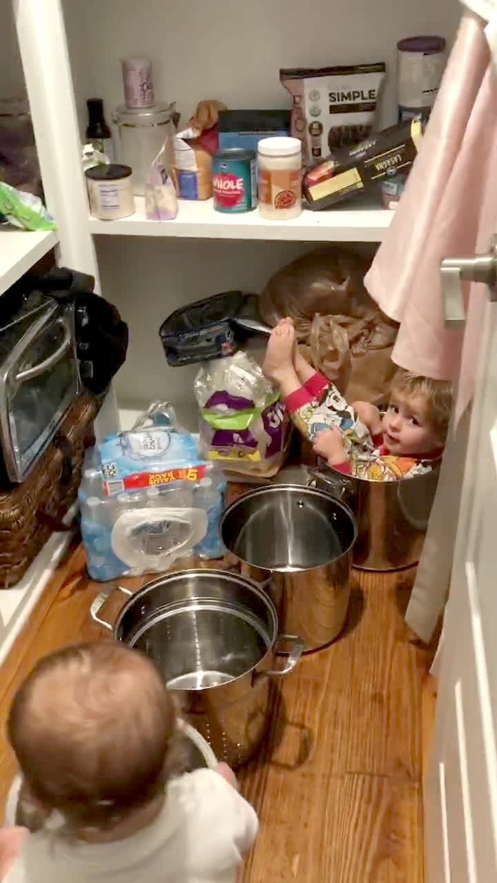 A young boy climbs onto the kitchen counter and reaches on top of the fridge to grab a bag of chips. He tries to climb down but he gets his pants caught on a cabinet handle and hangs there as he yells for help before he gets himself down.
