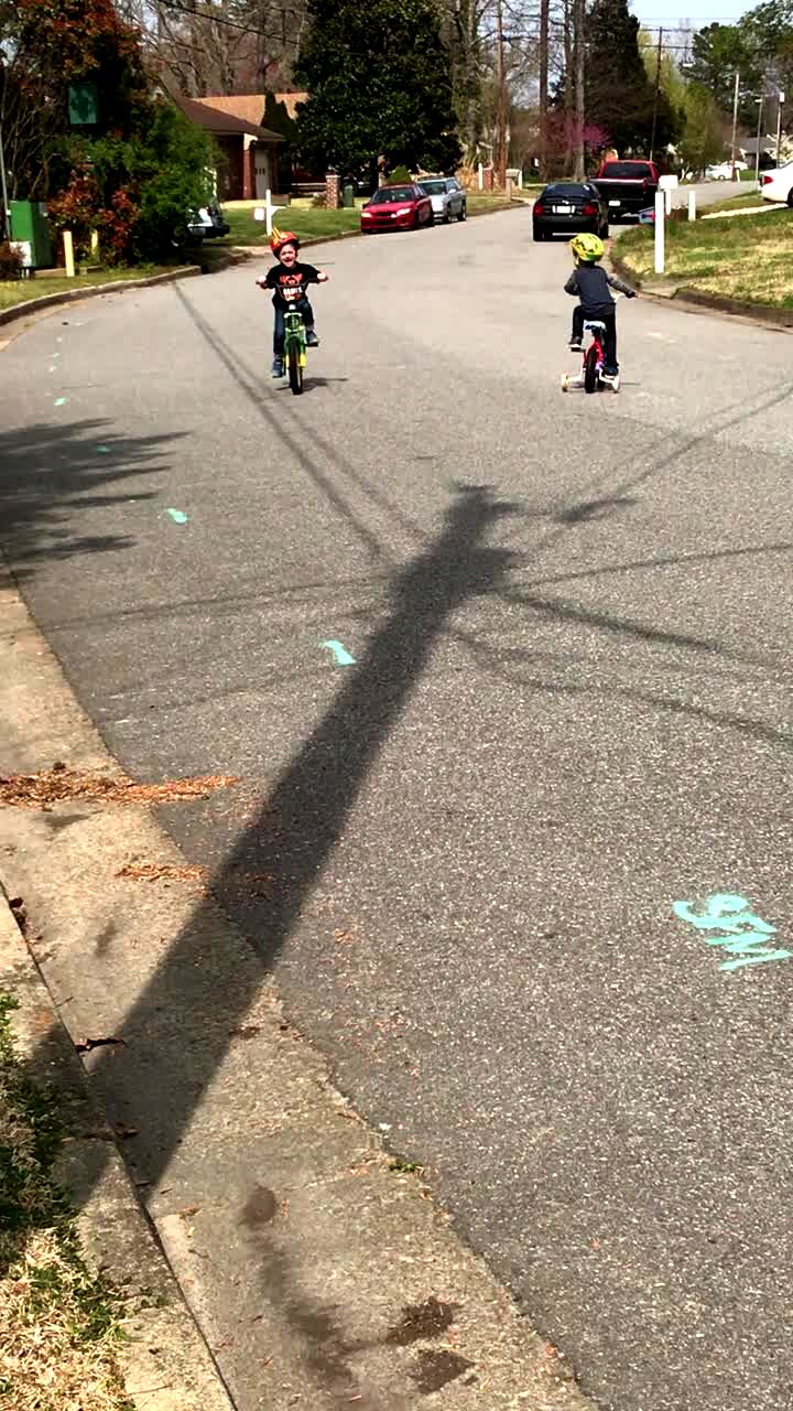A boy throws a large red ball that knocks over a young boy, bounces off the couch and knocks down his twin sister in slow motion indoors.