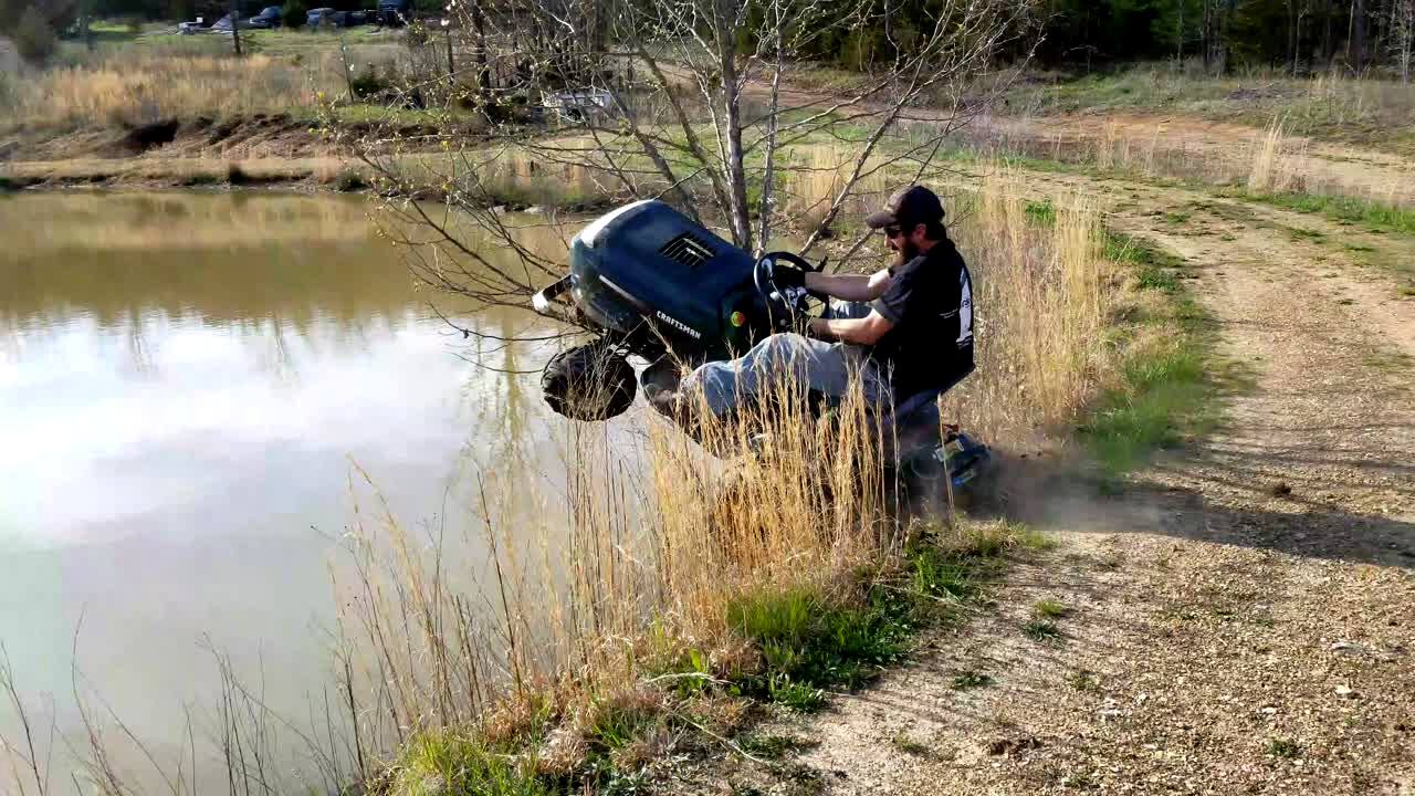 A man drives a lawnmower tractor up a hill and then loses control when he gets to the top and drives it into a pond.