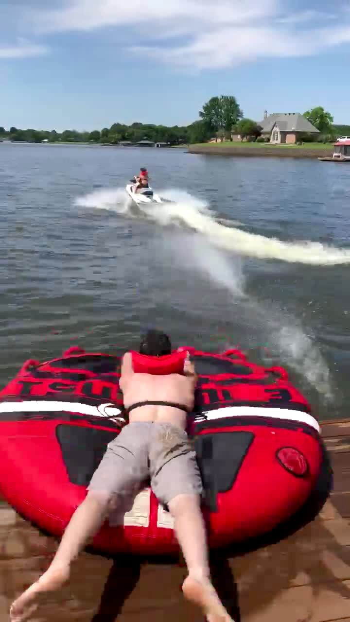 A teen boy tries to ride an inner tube but it rips out from under him on the dock.