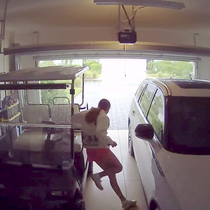 A teen girl in her garage steps out of a golf cart and slips. Another girl walks through the garage and slips one second later. Security Footage.