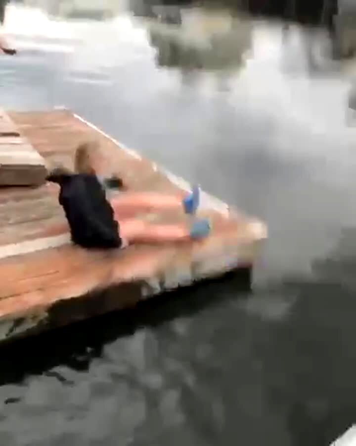A woman runs on a dock in a lake and jumps over a gap to get to another dock, but she slips when she lands and falls into the edge of the dock.