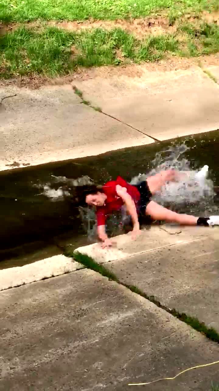 A young girl slips and falls over a small stream. She slides across the water and then falls on her rear.