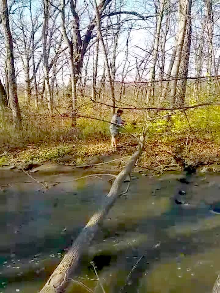 A man runs across a tree over a river. He jumps to the bank at the end, but falls in the water.