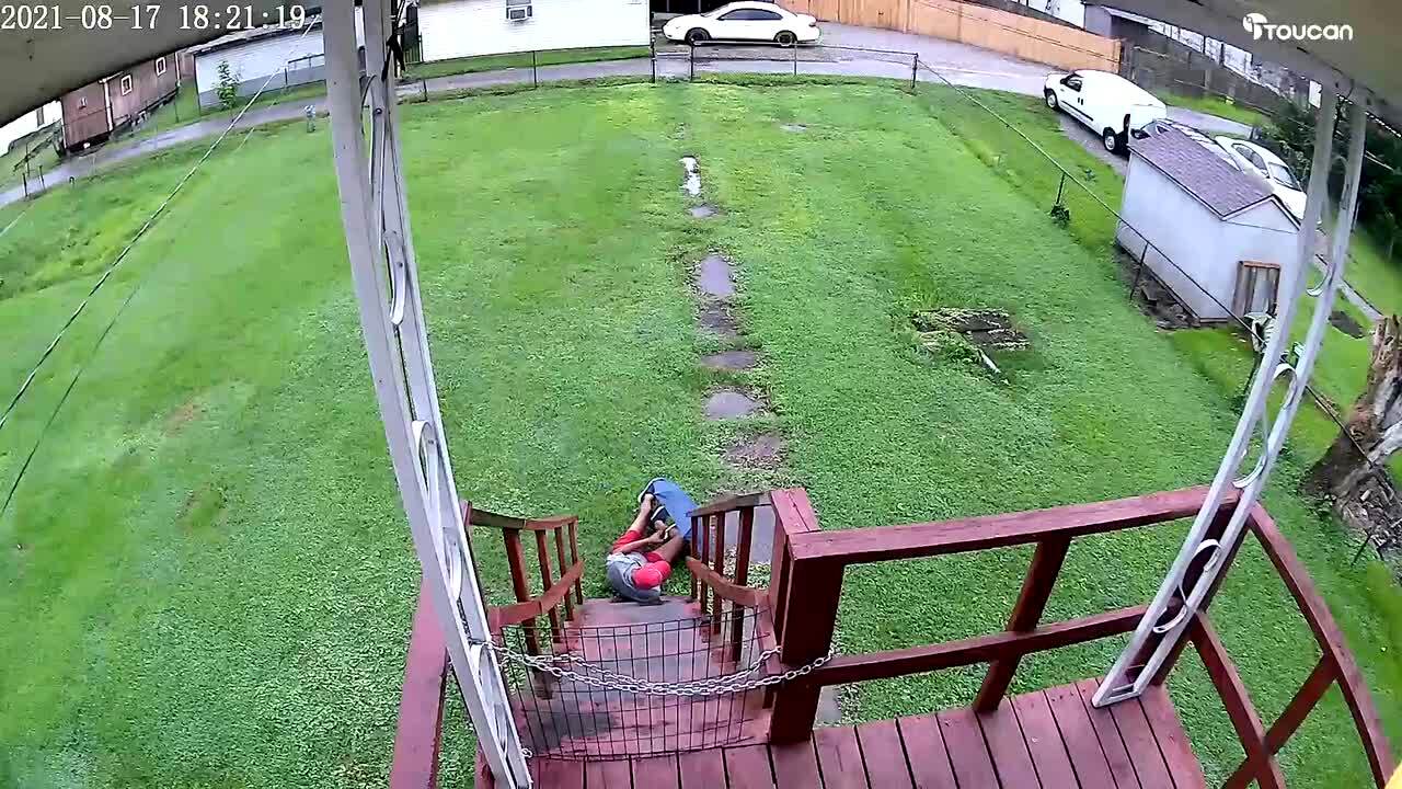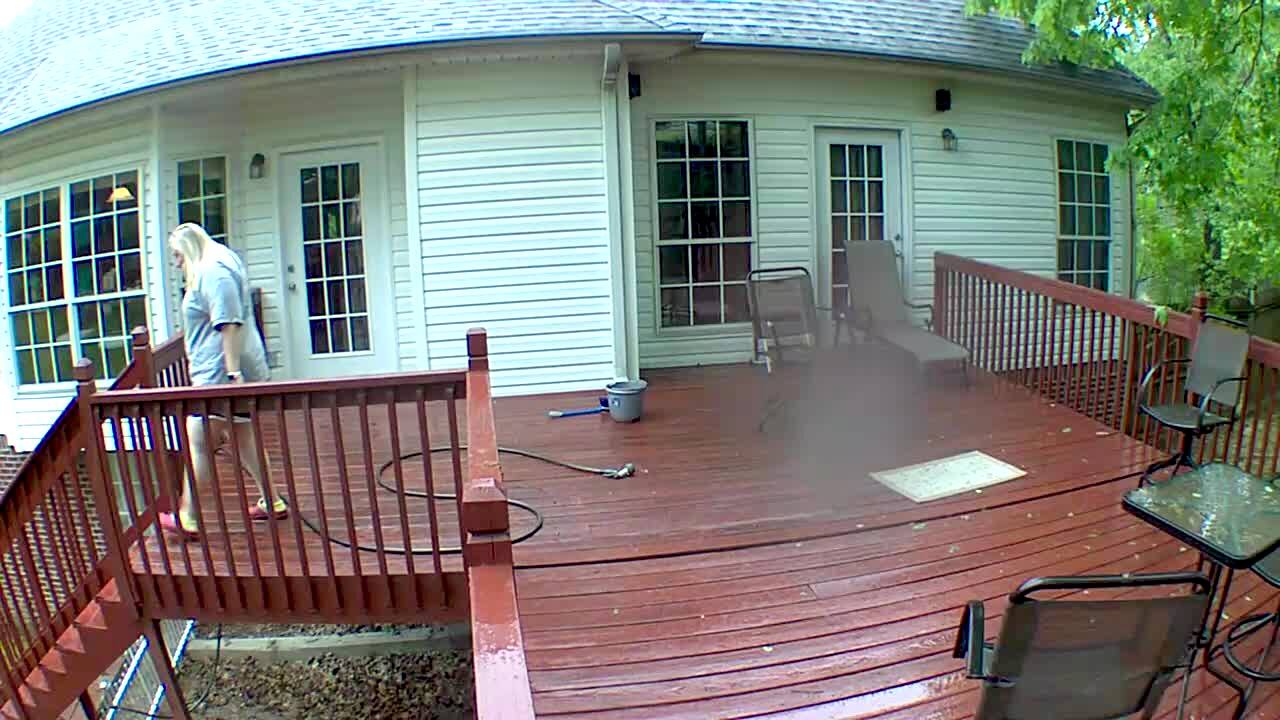 A woman falls down the stairs of her deck in the rain. Security Camera Footage.