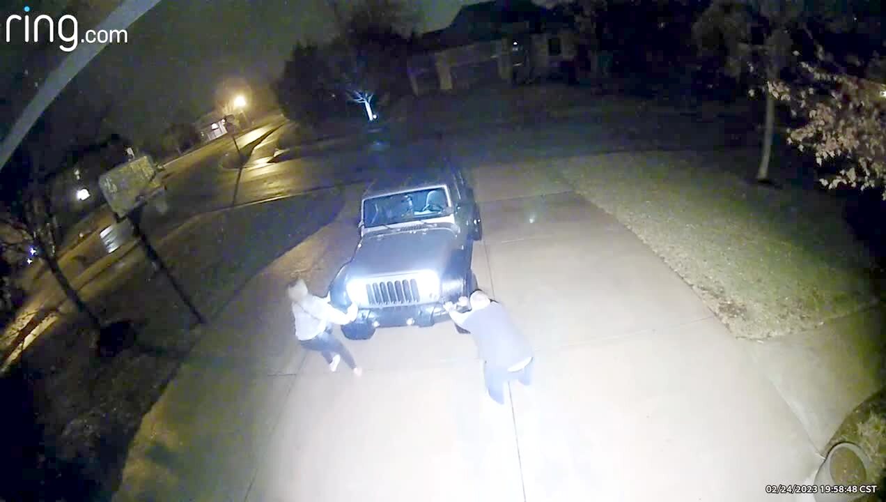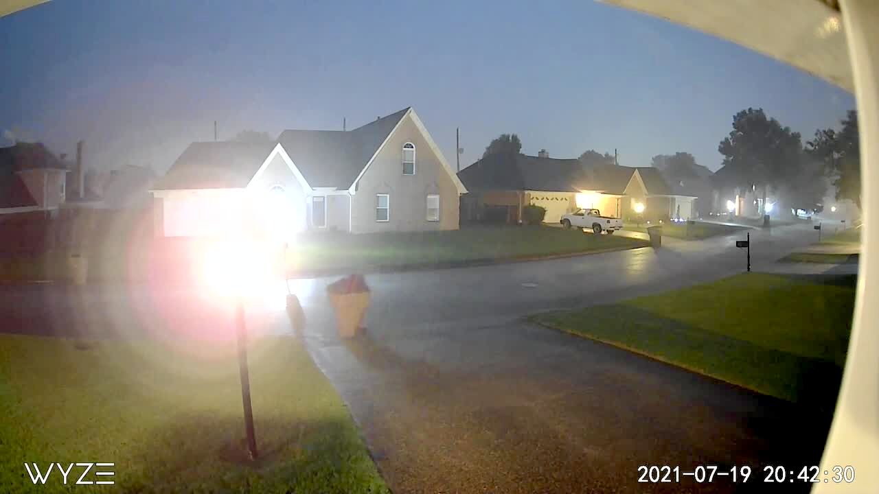 A trash can at the end of the driveway slowly slides away due to heavy rain. Security footage.