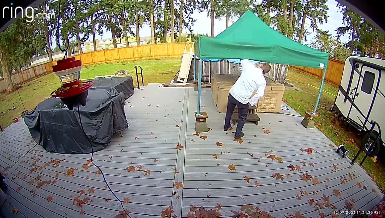 A man walks around on a patio, then he lifts up a canvas tent, and water pours onto his head. Security footage.
