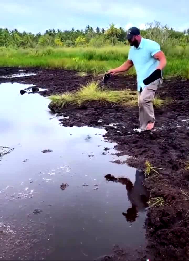 A man stands on the edge of what appears to be a shallow pond, then he tries to cross it, but he falls and disappears completely into the water.