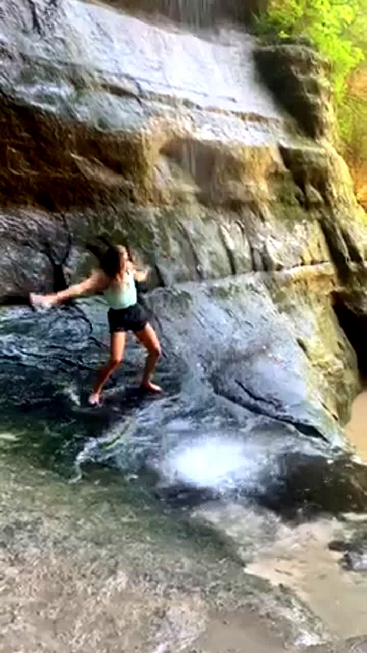A teen girl in a forest walks under a waterfall and slips on the rock and crashes and lands on the rock.