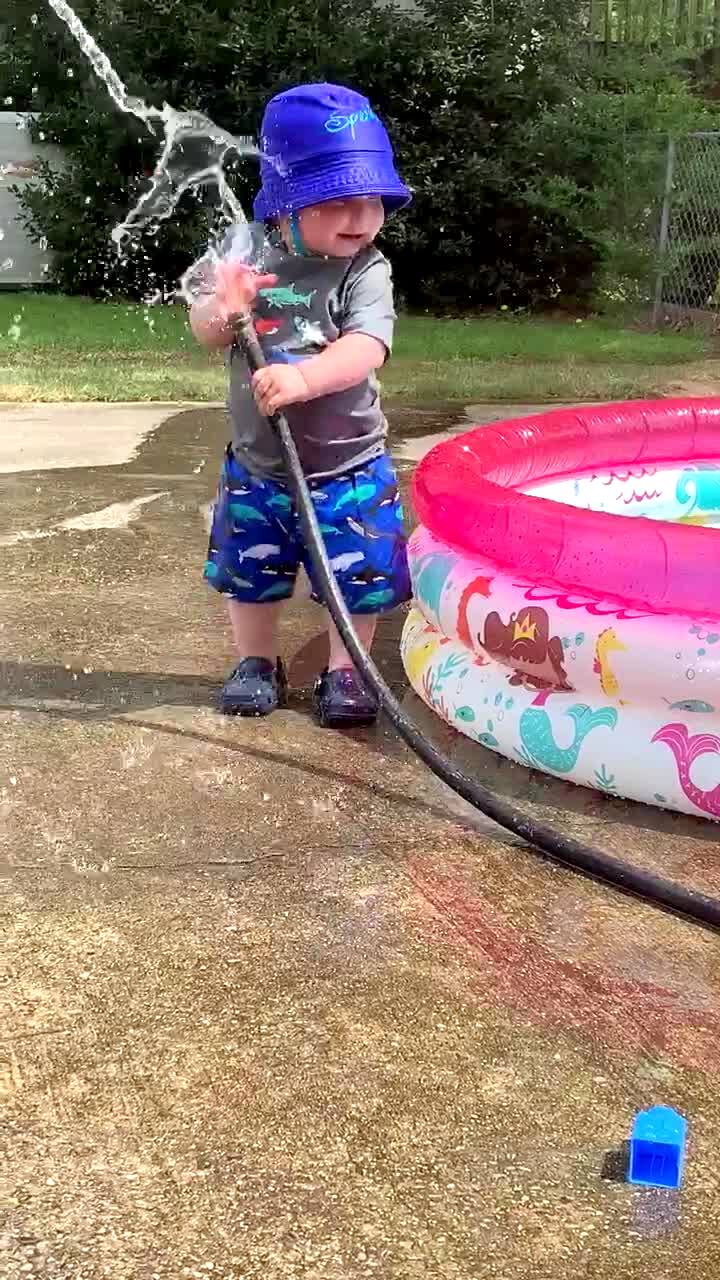 A tot boy holds a garden hose and splashes himself in the face every time he touches the stream of water. He loses control of the hose and falls down in a yard.