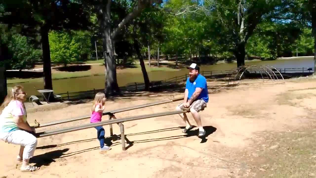 A man and woman ride a see saw at a playground park. The man breaks it and the woman falls down.