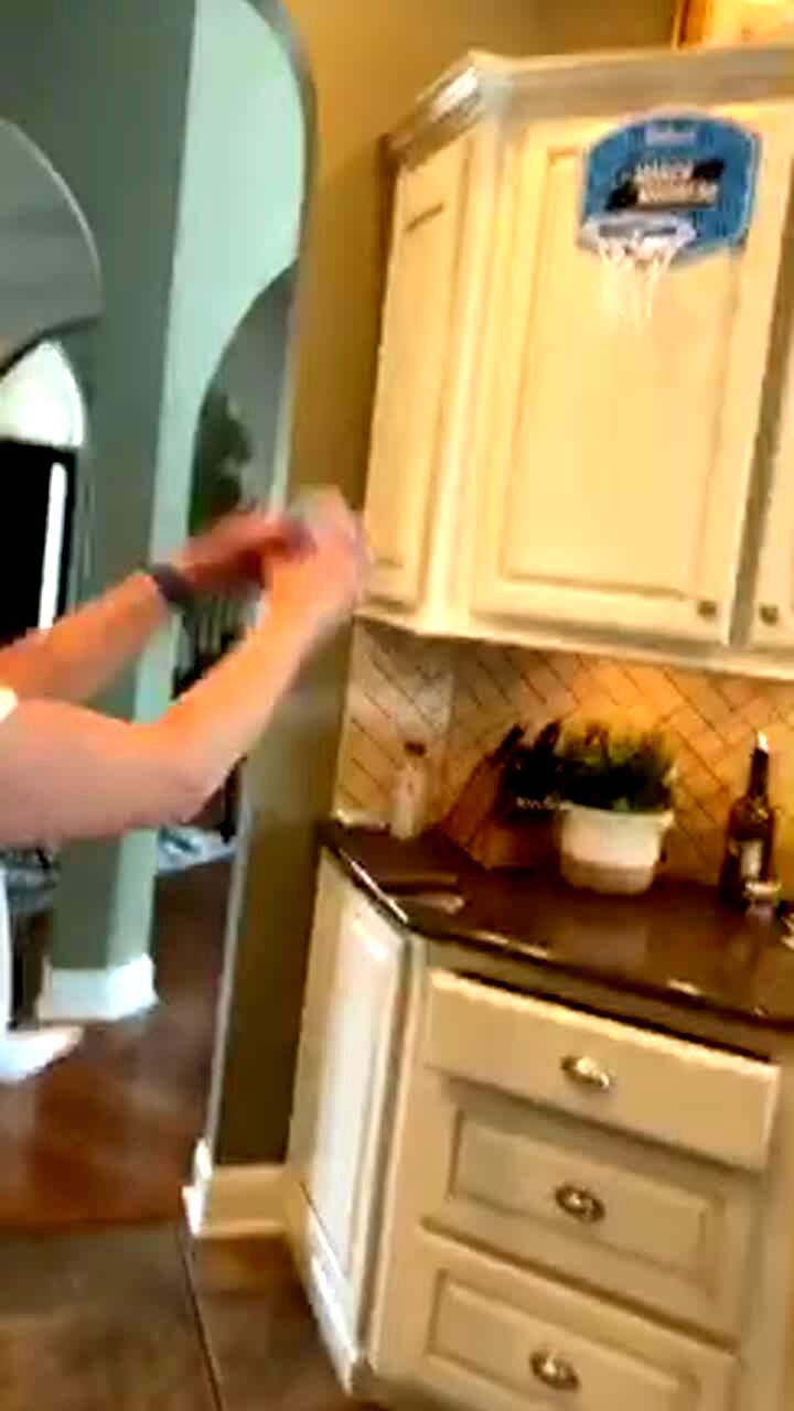 A woman shoots a mini basketball at a hoop in a kitchen but accidentally hits a picture frame. It falls down and shatters on the ground.