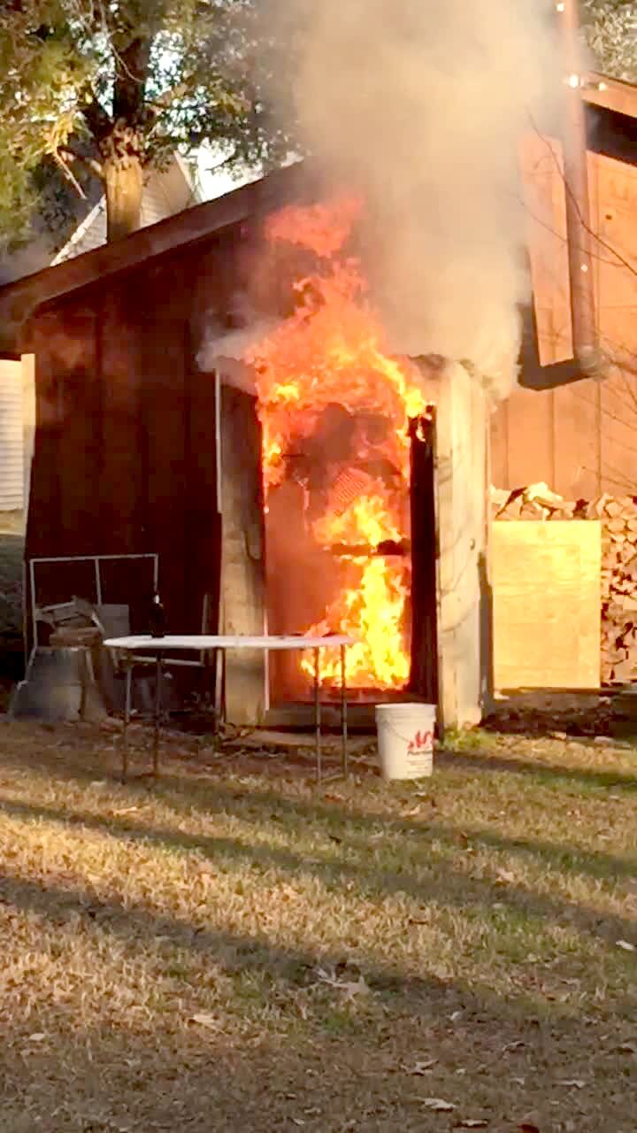 A man's meat smoker and house are on fire. He gets most of it out with a hose.