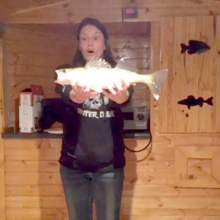 A woman holds a fish indoors and screams when he opens his mouth before throwing him back into a bucket.