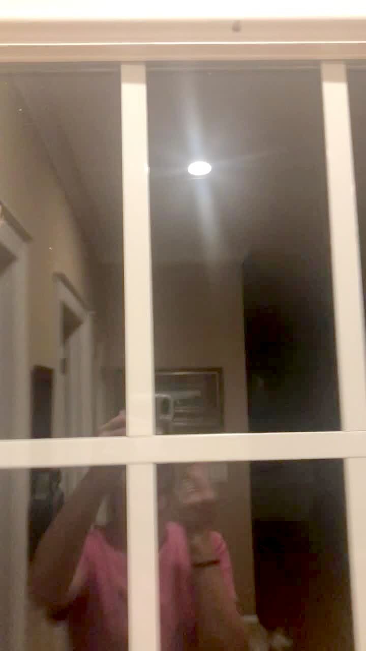 A woman screams when a frog jumps off a patio door into the house at night when she touches it because she thinks it's a toy.