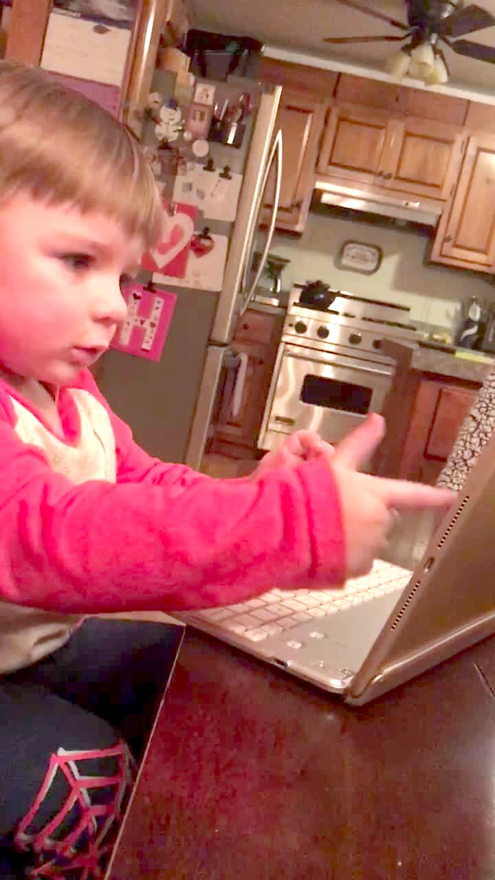 A tot boy sitting at the kitchen table seems frustrated by a tablet computer while pointing at the screen and tapping on the keyboard. He babbles, closes his eyes, sighs repeatedly and finally closes the lid.