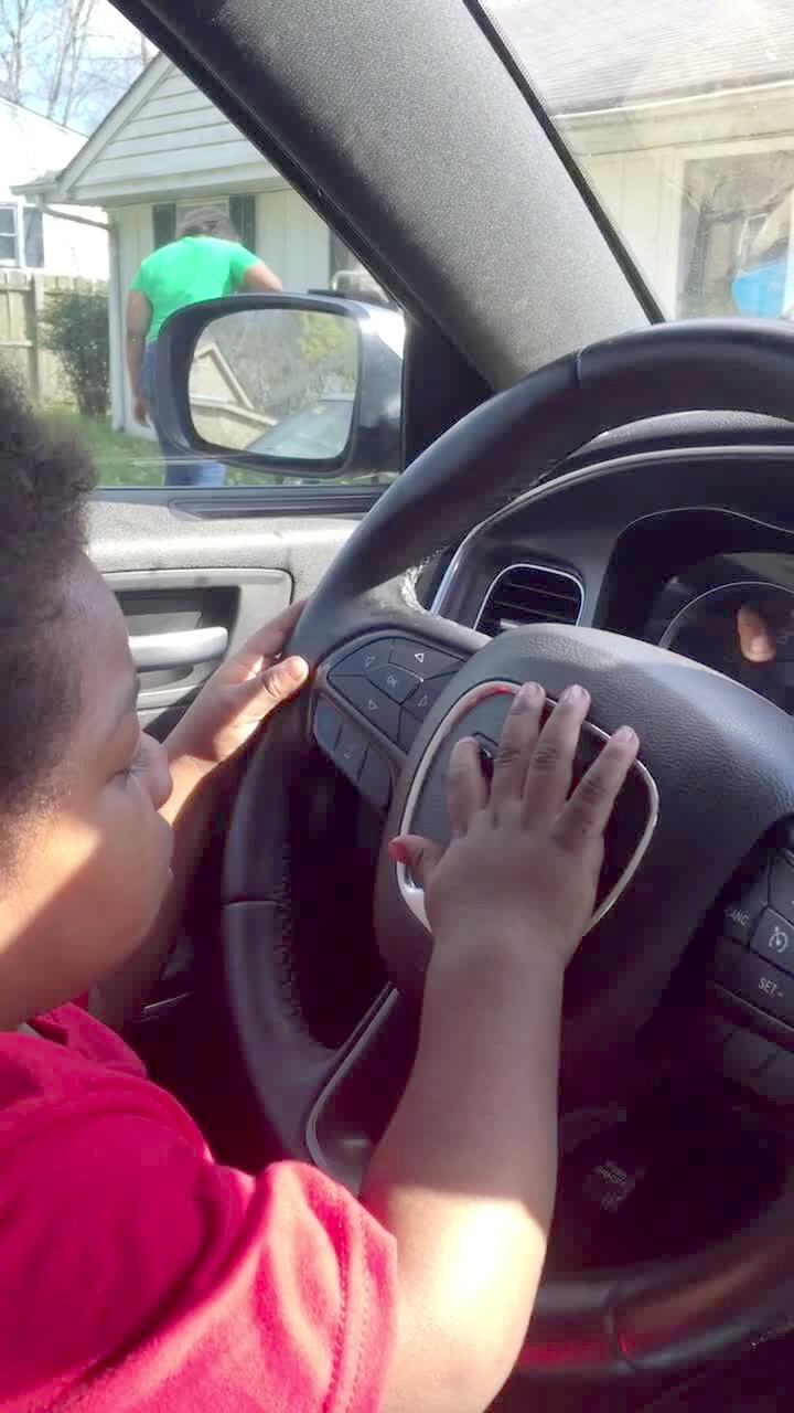 A tot boy blows on a car steering wheel when a woman tells him to blow its horn.