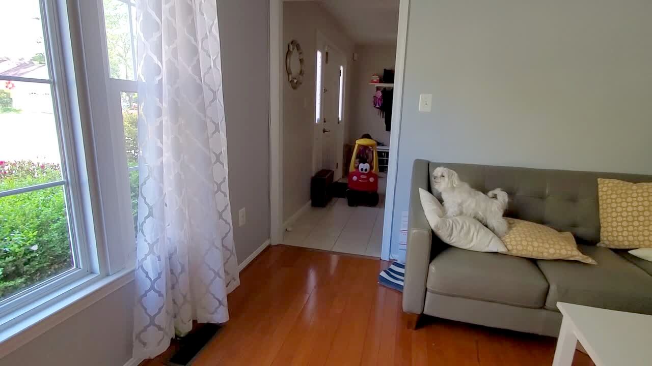 A tot girl pushes her younger sister in a Little Tikes car through a house and crashes her into the couch.