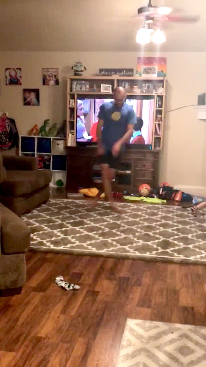 A man break dances in a living room and accidentally kicks a tot boy's leg and the tot boy falls to the ground.