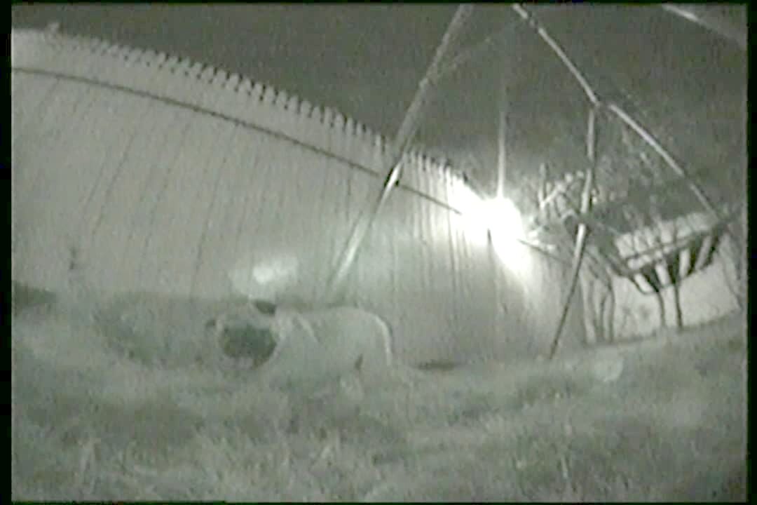 A dog bites at a hole in a living room couch, then he turns around and stares when a woman yells at him through a security camera. He looks into the camera and smells it. Security footage.
