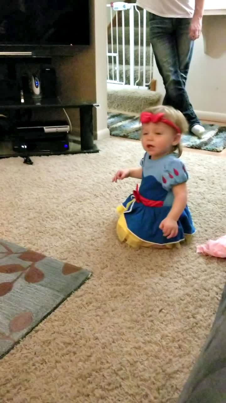 A tot girl looks up and a bow on her head while she spins around in circles in the living room.