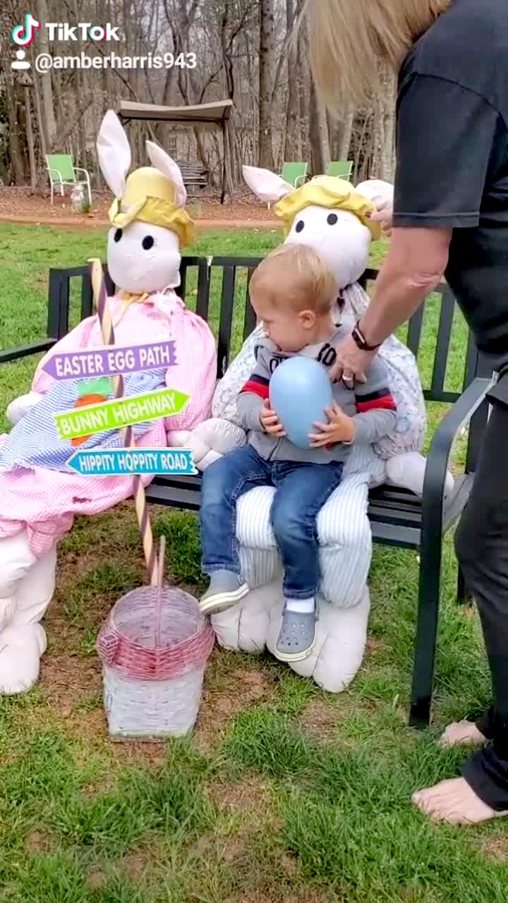 A tot boy sits on a stuffed Easter Bunny and screams and runs when the stuffed head falls onto him in a backyard.