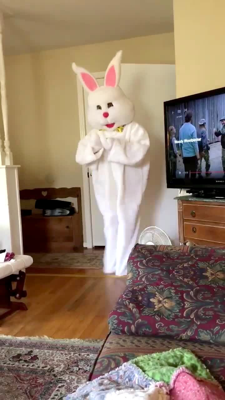 A woman walks into her living room dressed as the Easter bunny, and her head falls off. Her young boy realizes it's her and says "that's momma" as she walks out of the room.
