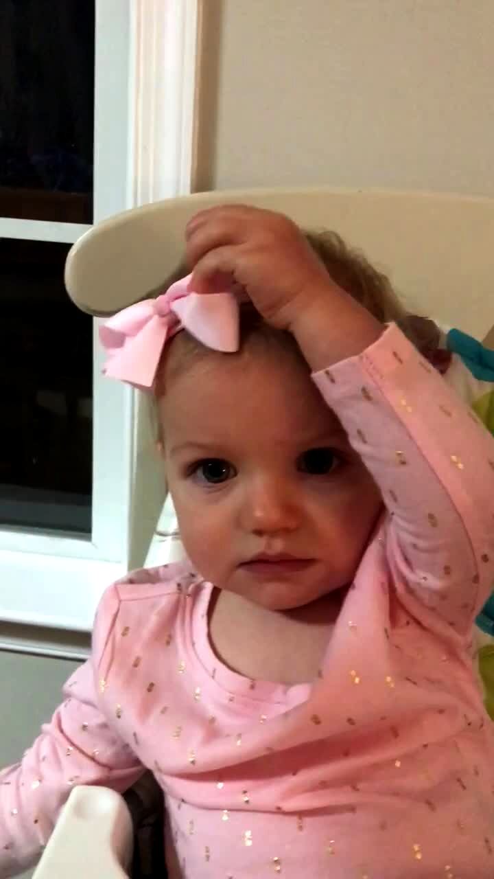 A baby girl pulls her headband in a living room and lets go of it and it hits her in the face and her mom laughs.
