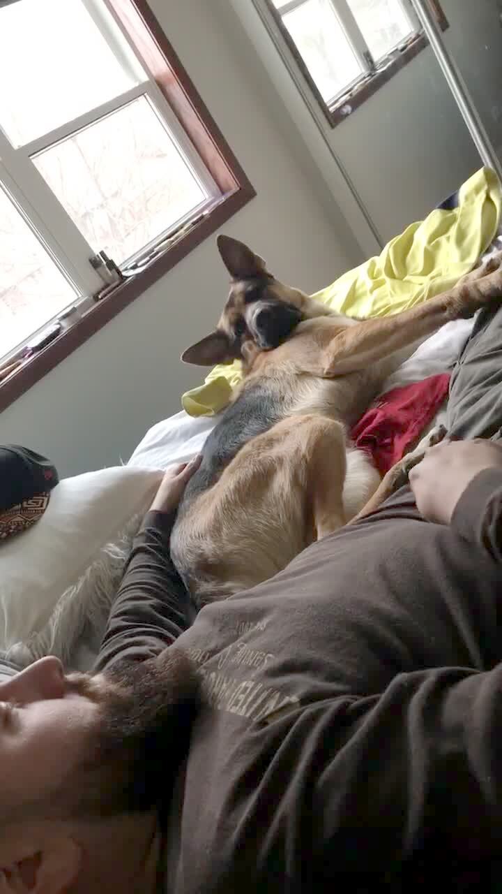 A German Shepherd dog kicks a man in the throat when the man tickles his paw and he laughs in a bedroom.